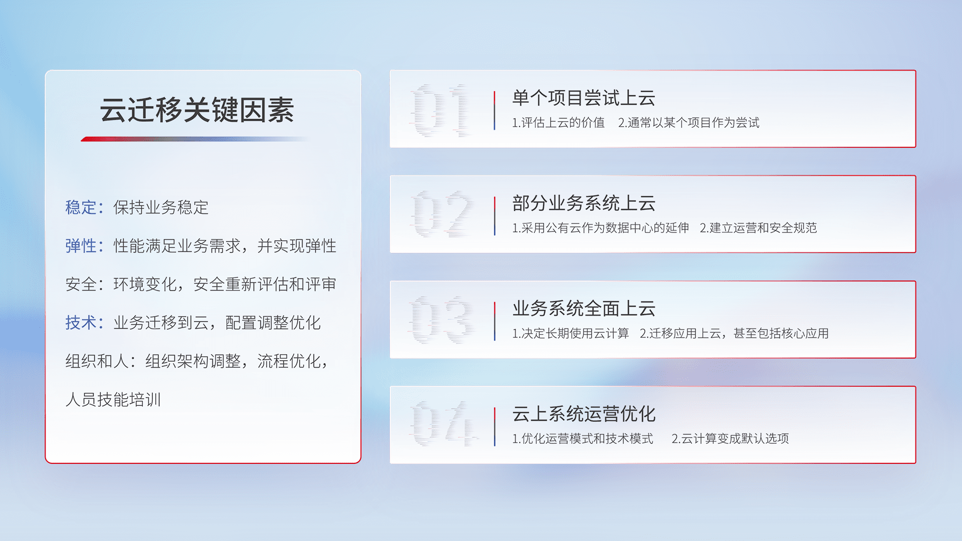 结合实际业务,,,从规划设计、、、、云平台选型、、云原生改造、、数据迁移、、集成交付,,迁移全过程为客户识别最佳上云路径,,做好风险识别管理,,,,设计网络架构、、、身份权限、、、安全审计合规、、操作审计、、、、日志审计、、监控告警策略、、、多站点容灾设计等,,对云上基础设施进行整体规划,,,,提升IT治理水平,,以满足弹性、、、高可用、、、、高性能的需求。。。。