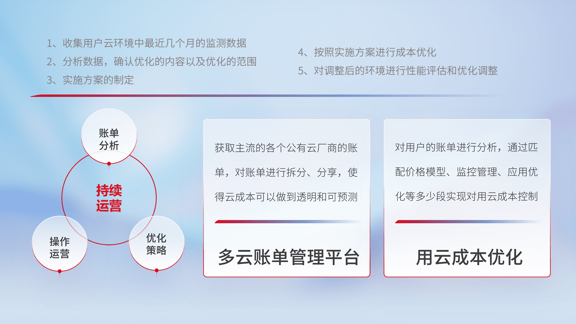 通过多云纳管,,,以统一的资源数据模型把客户的云资源进行抽象和封装,,,,进而实现对多云资源的统一操作,,保障云资源管理的可靠性、、、、稳定性与可用性。。量身定制化运维内容,,,,配置、、、开发运维、、、、补丁管理、、、备份、、、、监控、、、、认证和访问管理、、、审计和日常巡检等,,,保障在用云过程中的可靠度,,,,稳定度以及高可用率。。